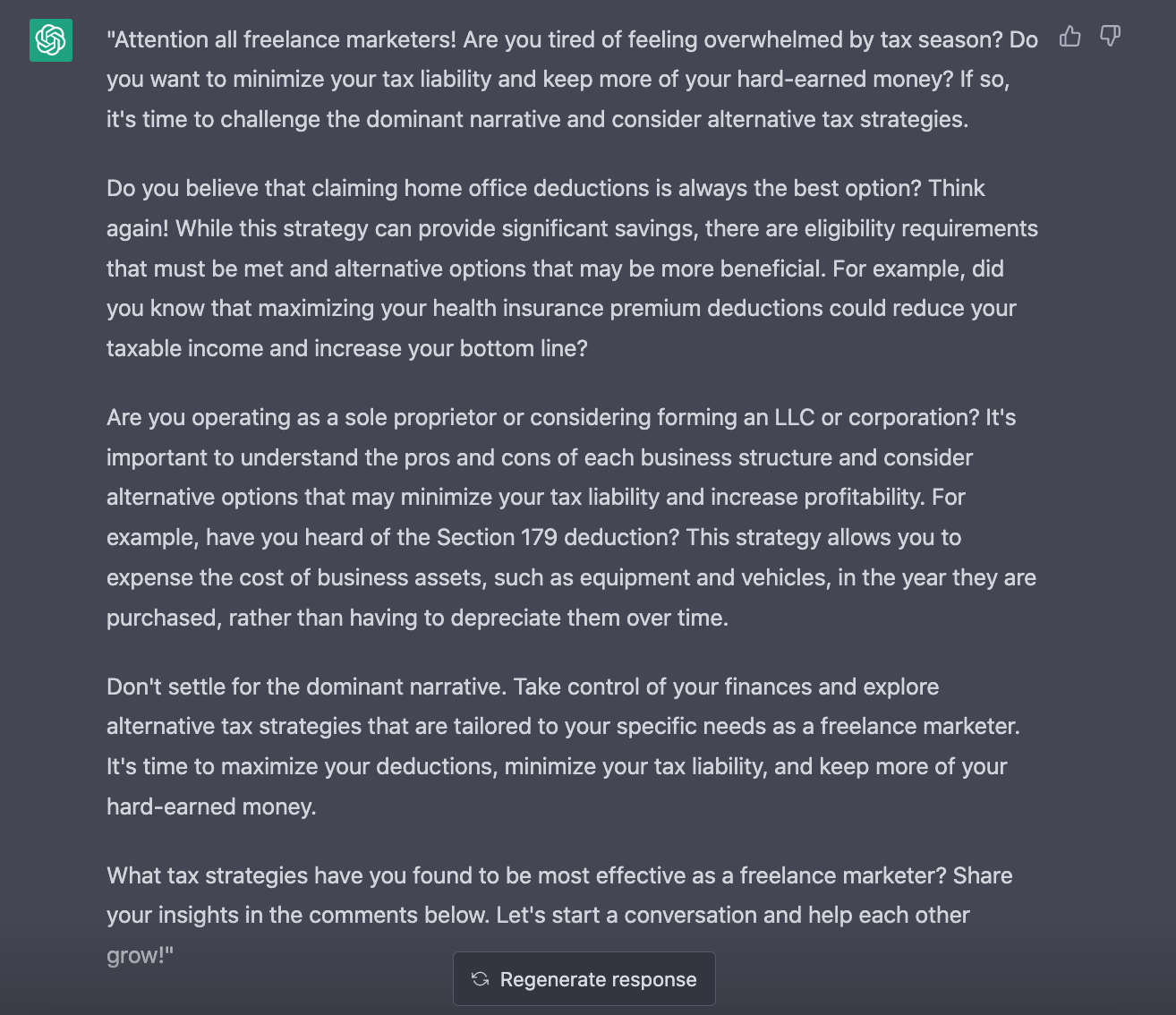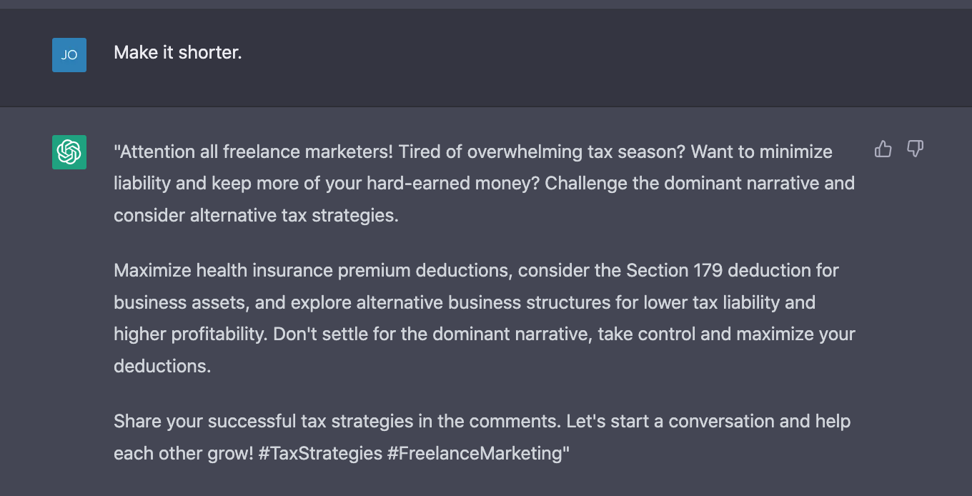 While ChatGPT can help you ideate your next content topic, let’s use something basic as our example: tax strategies for freelance marketers.