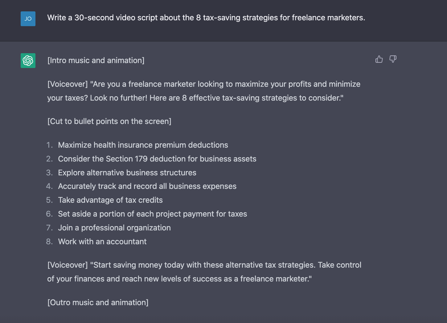 We have a blog post outline, a LinkedIn post, and 10 tweets. Now let’s use ChatGPT to create scripts for multimedia content. To illustrate, I asked the AI to write a 30-second video script about the 8 tax-saving strategies for freelance marketers. Here’s what it returned: