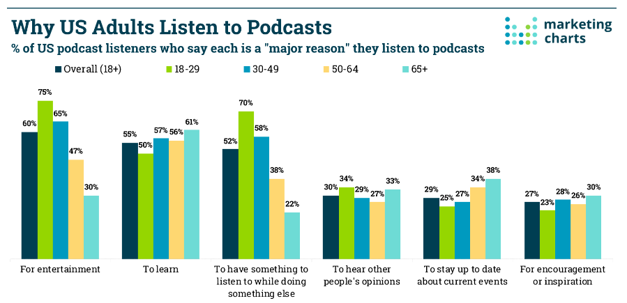 Consider your target listeners. Why are they listening to podcast media in the first place? According to a December 2022 survey of 5,132 U.S. adults (18+) by Pew Research, the most common “major reason” for listening to podcasts is for entertainment, as cited by 60% of respondents. Some 55% say that learning is a major reason for listening, and 52% say a primary reason is to have something to listen to while they do something else.