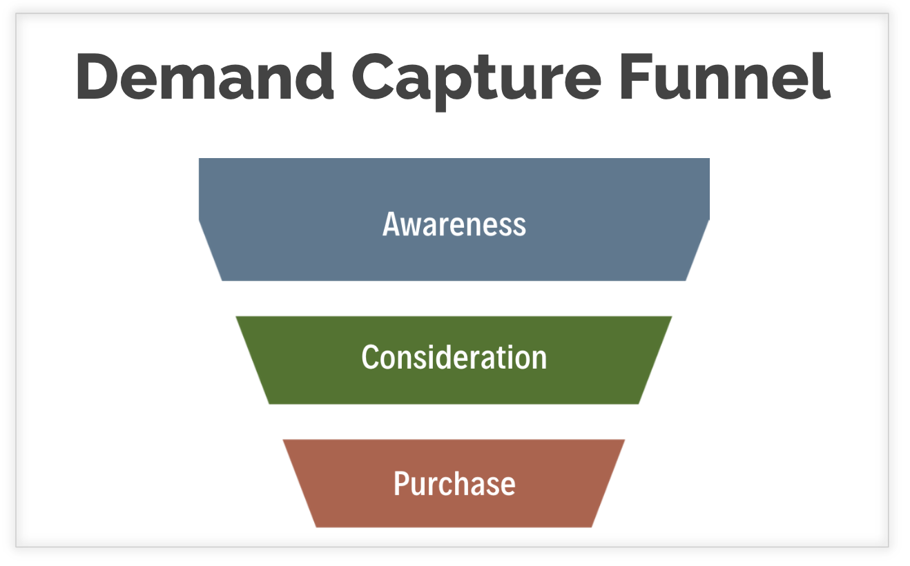For your website to capture market demand of buyers actively on a buying journey, your web pages should be organized based on the goal for each of the three market segments. One common way to visualize such demand capture is the marketing funnel (illustrated below).
