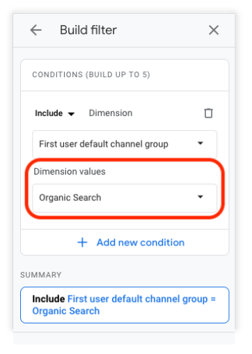Then, filter your report by organic search traffic by selecting a condition to include only web visitors with a first user default channel group of “Organic Search.” This will show you which pages users are landing on from organic search results pages. This is a beneficial report when doing SEO for accountants.
