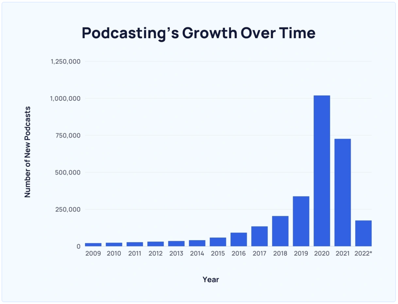 If there’s one silver lining that came out of the pandemic, it was a rapid adoption of video meeting software like Zoom. This led to an explosion of podcasts in 2020 and 2021, illustrated in the chart below from Exploding Topics: