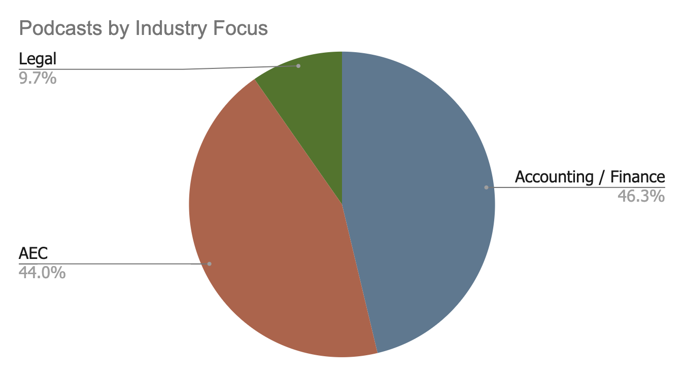 Recently, I looked at a sample of 147 podcasts across accounting, AEC, and legal industries to explore their characteristics. I wanted to see if I could notice any unique differences or commonalities worth exploring further.